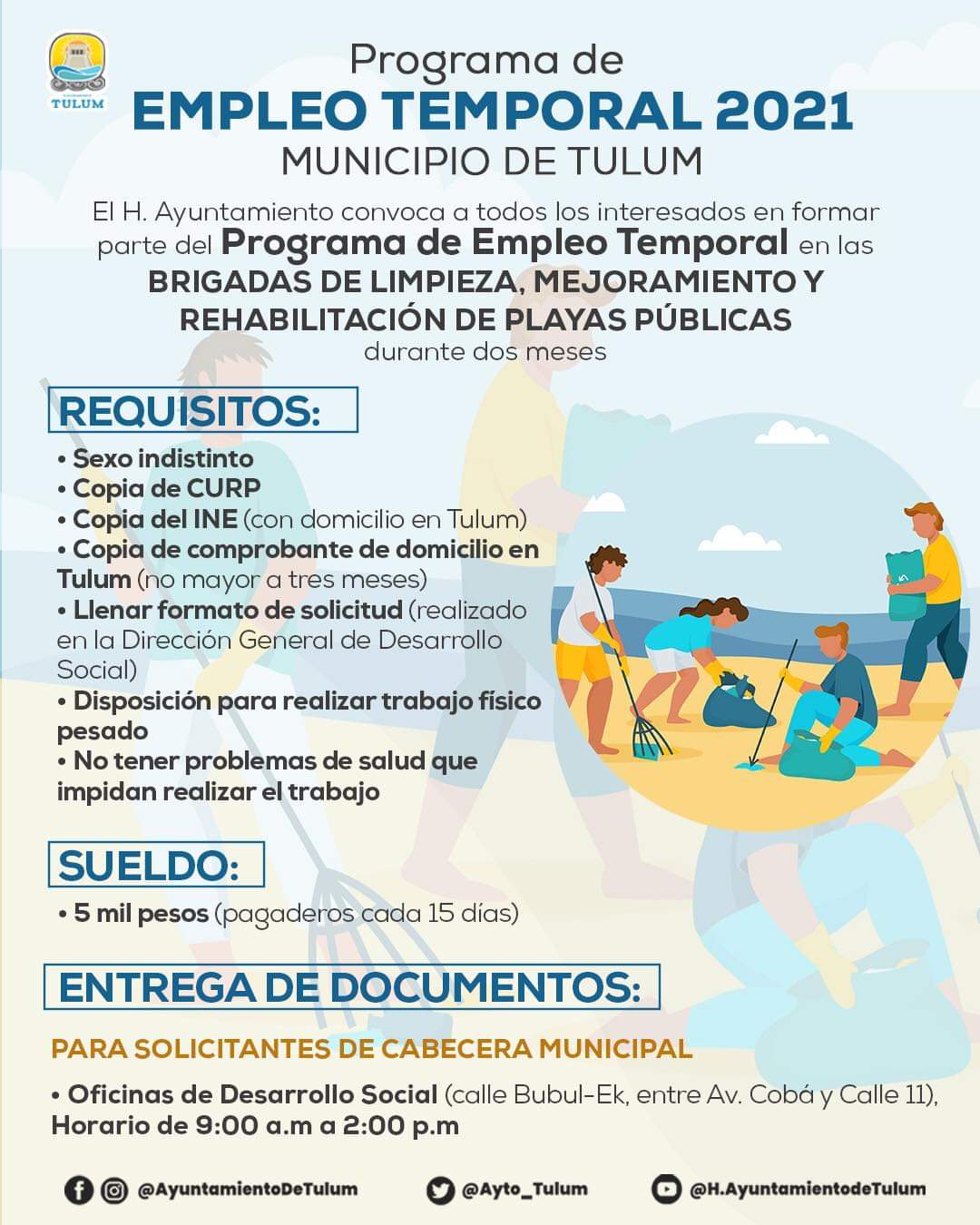 Los interesados deben acudir a las oficinas de la Dirección de Desarrollo Social en la calle Bubul-Ek entre avenida Cobá y calle 11, con copia de credencial de elector, CURP y comprobante de domicilio, en horario de 9:00 a 14:00 horas, asimismo deben tener disposición para realizar trabajo físico pesado y no tener problemas de salud que les impida hacer el mismo.