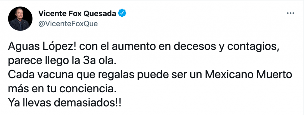En sus redes sociales, Fox escribió un mensaje dirigido al presidente Andrés Manuel López Obrador en el que destacó que, ante el aumento de decesos y contagios por coronavirus, todo indica que ha llegado la tercera ola de la pandemia