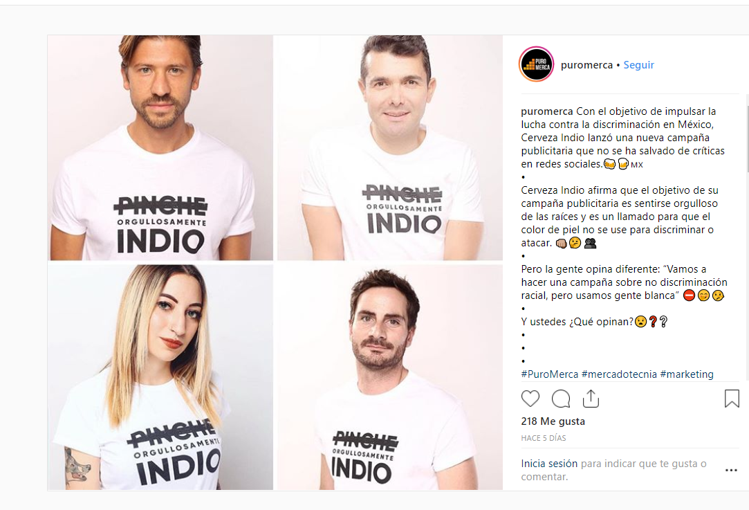 Sin embargo, en ella participaron puros modelos caucásicos, que irónicamente usaban camisetas que decían “Pinche Indio“, las cuales tenían tachado la palabra “Pinche” sustituyéndola debajo, con la palabra “orgullosamente“. Para dejar como correcta la idea “orgullosamente Indio“.