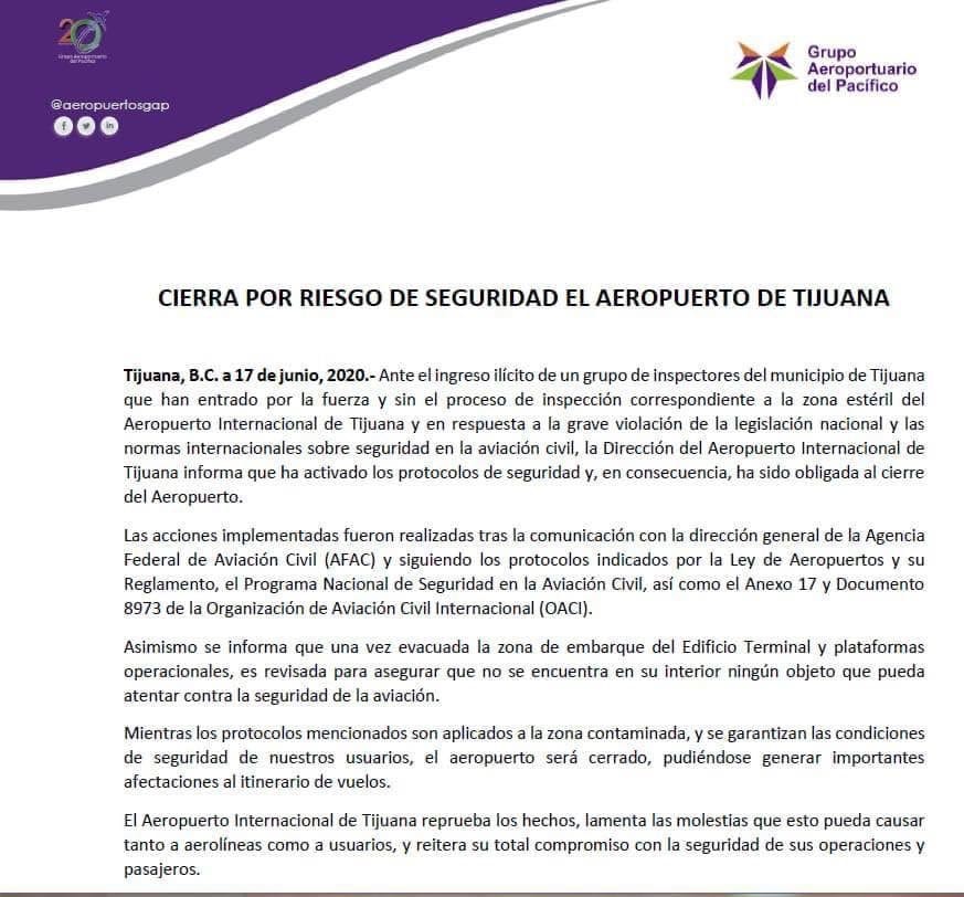 “En respuesta a la grave violación de la legislación nacional y las normas internacionales sobre seguridad en la aviación civil, la Dirección del Aeropuerto Internacional de Tijuana informa que ha activado los protocolos de seguridad y, en consecuencia, ha sido obligada al cierre”, señaló GAP.