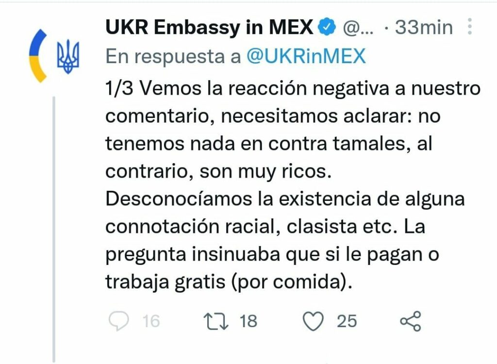 Por lo pronto la cuenta de la Embajada de Ucrania en México ya es mal vista por algunas persona en México por pelearse con periodistas, por lanzar insultos clasistas y hasta por meterse con los tamales. ¿Qué tal? Por ello salió lo de #EmbajadaTamalera.