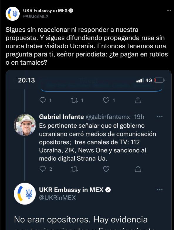Todo comenzó cuando un periodista denunció que el gobierno de Ucrania cerró medios de comunicación incómodos para el gobierno de Volodymyr Zelensky. Ahí el CM de la Embajada de Ucrania en México le dijo que esas eran fake news y que desinformaba.