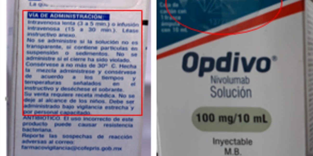 En el caso deL Opdivo (nivolumab), la Cofepris detectó que en la presentación de 100mg/10mL, fabricadas por Bristol Myers Squibb de México e indicado para tratar carcinomas, melanomas, cáncer de pulmón y linfoma de Hodgkin.