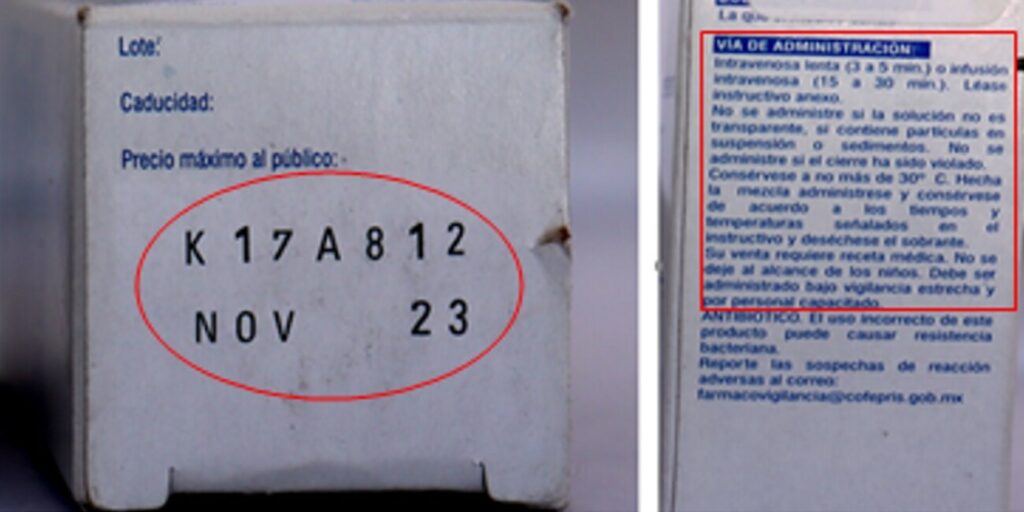 Sin embargo, el lote K17A812 no fue elaborado por la empresa. Parte de las irregularidades incluyen textos de vía de administración con errores ortográficos.