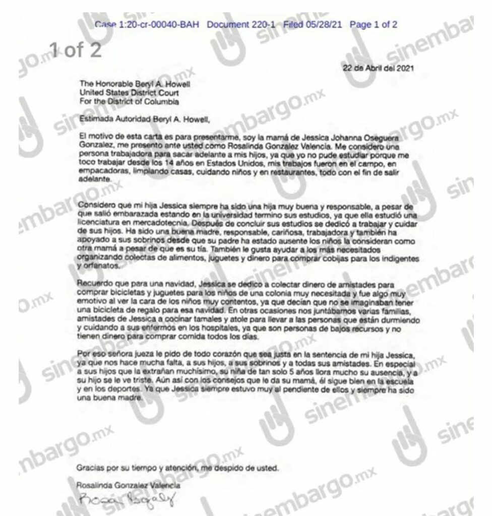 Estas cartas son firmadas por Rosalinda Gonzalez Valencia, madre de la detenida, su hermana Laisha Michelle Oseguera Cervantes y una prima de nombre Melissa.
