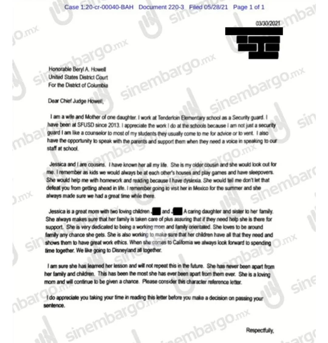 En la carta de la madre, se dice que que Jessica es una persona muy trabajadora, que cuida a sus hijos y que se ha dedicado a ayudar a los más necesitados.
