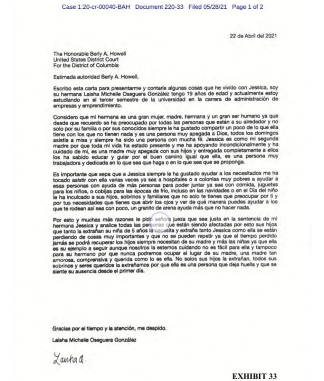 En otra carta, Laisha Michelle, quien asegura tener 19 años y estar estudiando el tercer semestre de la carrera de Administración de Empresas y Emprendimiento, le dice a la juez que su hermana ha sido como su segunda madre porque “toda mi vida ha estado presente y me ha apoyado incondicionalmente y ha cuidado de mi”.