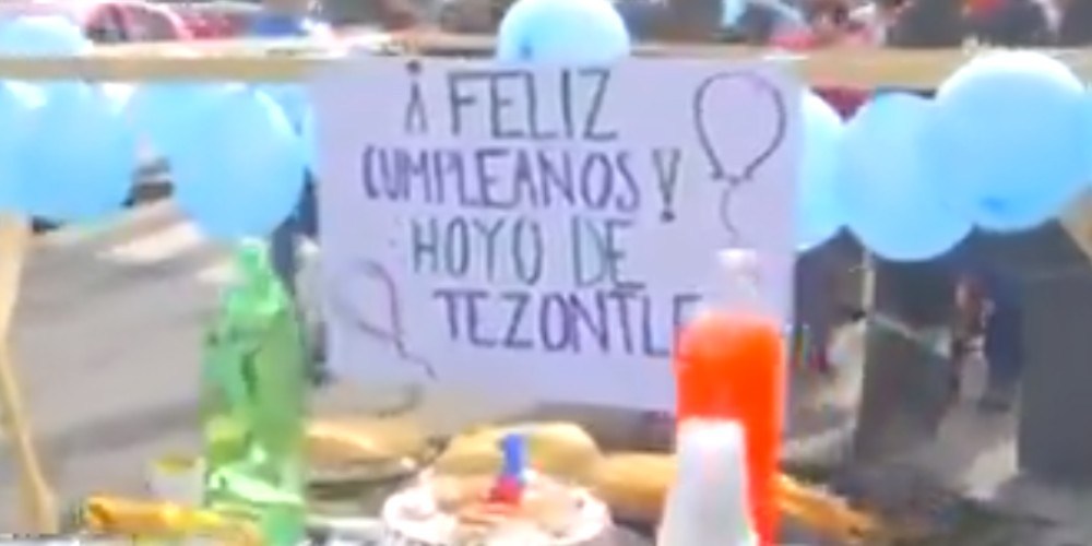 En esta fiesta incluyeron pancartas alusivas a su inconformidad, colocadas en la Av. Canal de Tezontle. Algunas decían “¡Feliz cumpleaños hoyo de Tezontle!”.