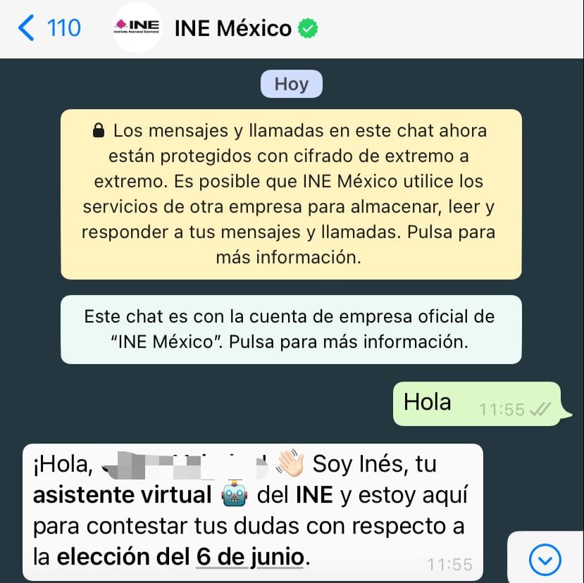 Para iniciar la interacción el usuario debe enviar la palabra “Hola” y enseguida “Inés”, la asistente virtual del INE, le dará la bienvenida, además de exhortarlo a conocer los protocolos sanitarios a seguir durante los comicios.