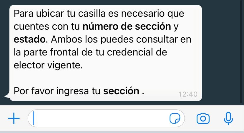 Posteriormente se despliega un menú con cinco opciones enumeradas para recibir información sobre cómo ubicar su casilla, entre otras cosas.
