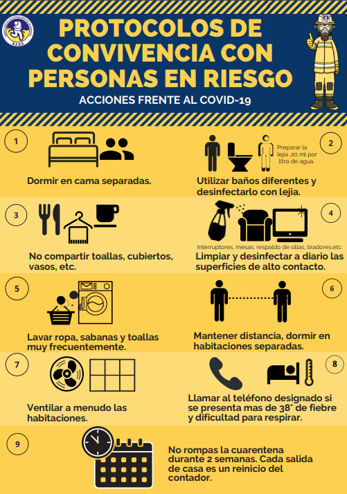 Por otra parte, GEOS sugiere lo siguiente en relación a la convivencia con personas en riesgo: dormir en camas separadas, utilizar baños diferentes y desinfectarlos diariamente, no compartir cubiertos ni vasos y limpiar las superficies de alto contacto.