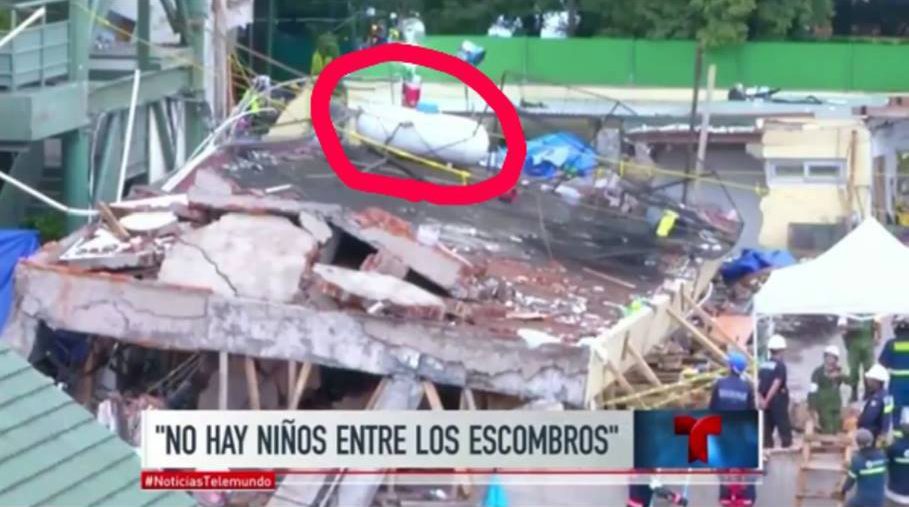 En otra fotografía, se aprecia un tanque de gas estacionario grande sobre la zona de la azotea del edificio que se derrumbó.