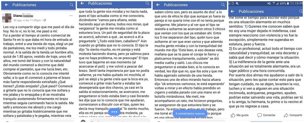 Otra mujer informó el redes sociales que estaba probándose ropa en una tienda el Centro Comercial Santa Fe, en la Ciudad de México y al salir de una tienda fue interceptada por un varón quien usaba un traje y tenía cerca de 40 años.