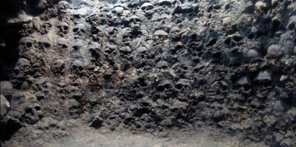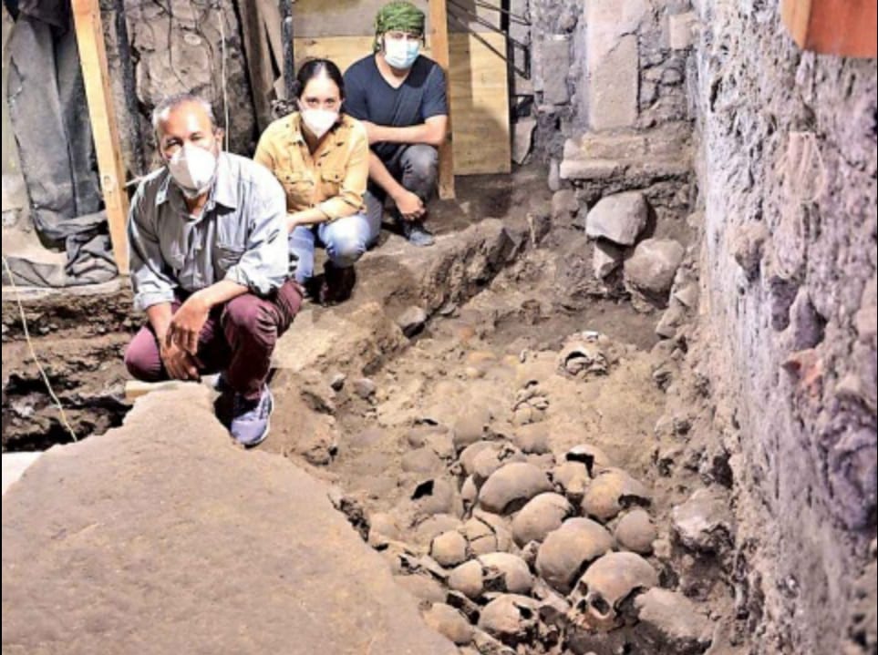 Y ahora en pleno 2020, durante los trabajos de remodelación del edificio histórico de la calle República de Guatemala 24, los arqueólogos localizaron el extremo este y la fachada externa de aquella torre o muro circular de cráneos humanos, de 4.7 metros de diámetro.