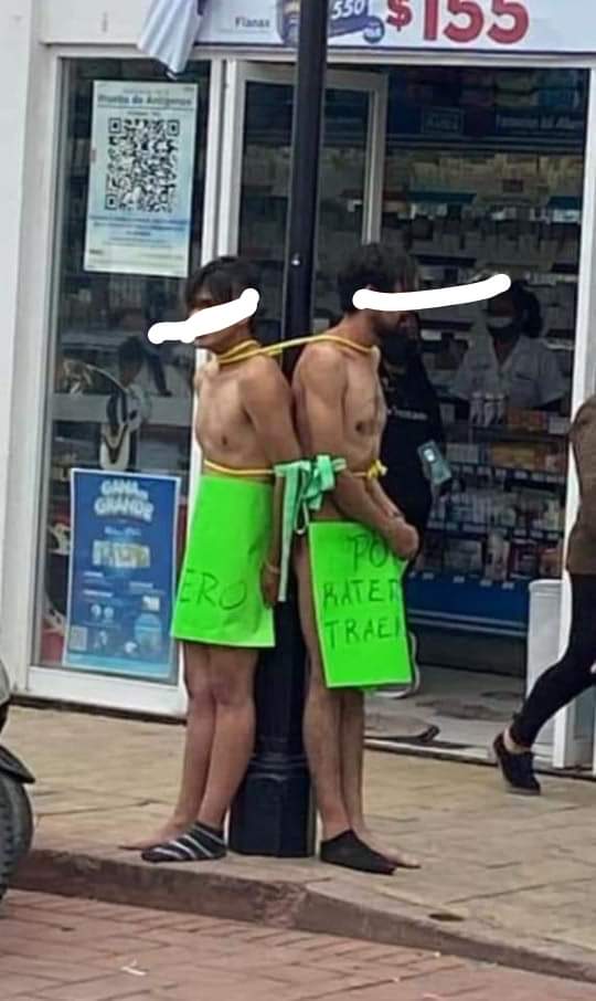 Ambos fueron detenidos con una soga al poste y cubrían sus partes íntimas sólo con un cartel en color verde neón que indicaba que se trataba de ladrones.