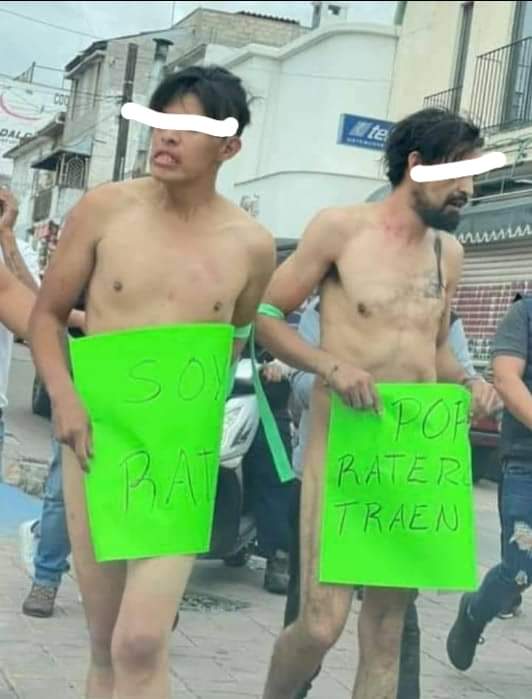 Razón, por la que además de desnudarlos por completo (con excepción de un calcetín cada uno), los tuvieron amarrados a un poste de luz durante un tiempo para que la gente al pasar los pudiera ver.