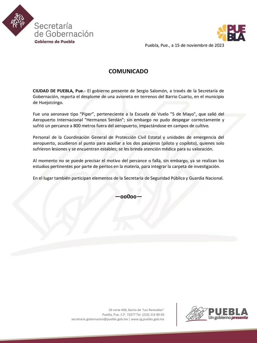 Por su parte, la Secretaría de Gobernación de Puebla detalló que el accidente sucedió a 800 metros fuera del aeropuerto y el impacto fue en campos de cultivo de la zona (como se puede ver en la fotografías) asimismo indicó que no se conoce el origen de la falla pero ya iniciaron las investigaciones.