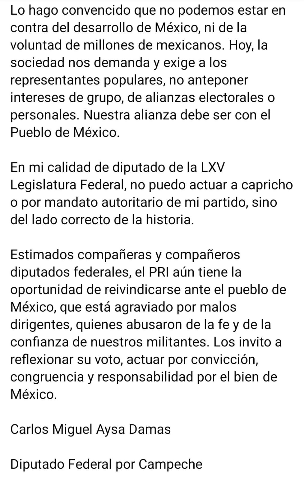 Fue mediante un post en redes sociales que el legislador priista dio a conocer su postura. Dijo que su partido no le podía imponer nada y que él toma su decisión libremente y convencido de que la reforma es lo mejor para México. Que votará del lado correcto de la historia.