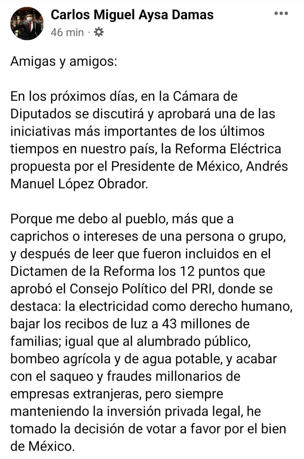 El diputado del PRI Carlos Miguel Aysa Damas ha anunciado que contrario a lo que ordenó la dirigencia de su partido él votará a favor de la reforma eléctrica propuesta por el presidente López Obrador. Por ello ha sido felicitado por los militantes y simpatizantes de la 4T. Y a la vez ha sido repudiado por el bloque opositor, que lo ha llamado un traidor.