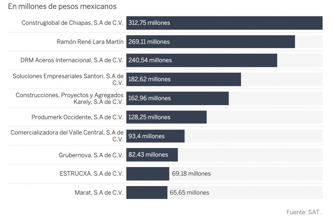 También usó empresas fantasma en trabajos de mejoras en carreteras o caminos rurales y en obras de mantenimiento o adecuación de sus bases aéreas, prisiones o centros de justicia. Fueron 10 las empresas fantasma que le facturaron al Ejército Mexicano, cuyos nombres se pueden ver en la siguiente imagen.