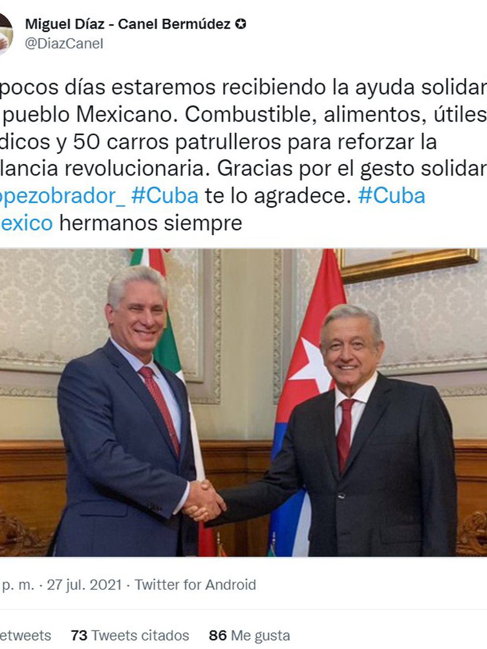 “En pocos días estaremos recibiendo la ayuda solidaria del pueblo Mexicano. Combustible, alimentos, útiles médicos y 50 carros patrulleros para reforzar la vigilancia revolucionaria. Gracias por el gesto solidario @lopezobrador_ #Cuba te lo agradece. #Cuba #Mexico hermanos siempre”, fue la publicación que se hizo desde dicha cuenta.