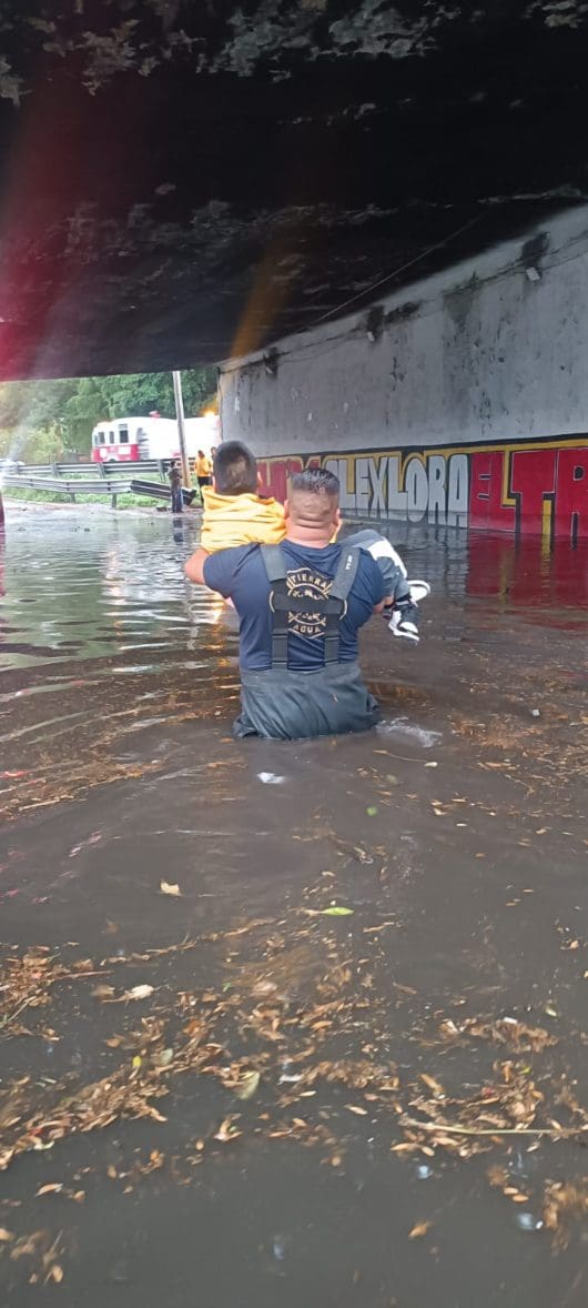 Encharcamientos en las principales avenidas de Ecatepec, Coacalco, Cuautitlán Izcalli y Tlalnepantla, en el Estado de México (Edomex), provocó una fuerte lluvia registrada la tarde de este domingo, por lo que en el ultimo municipio fue necesario rescatar a 35 pasajeros de un camión que quedo atrapado en un bajo puente.