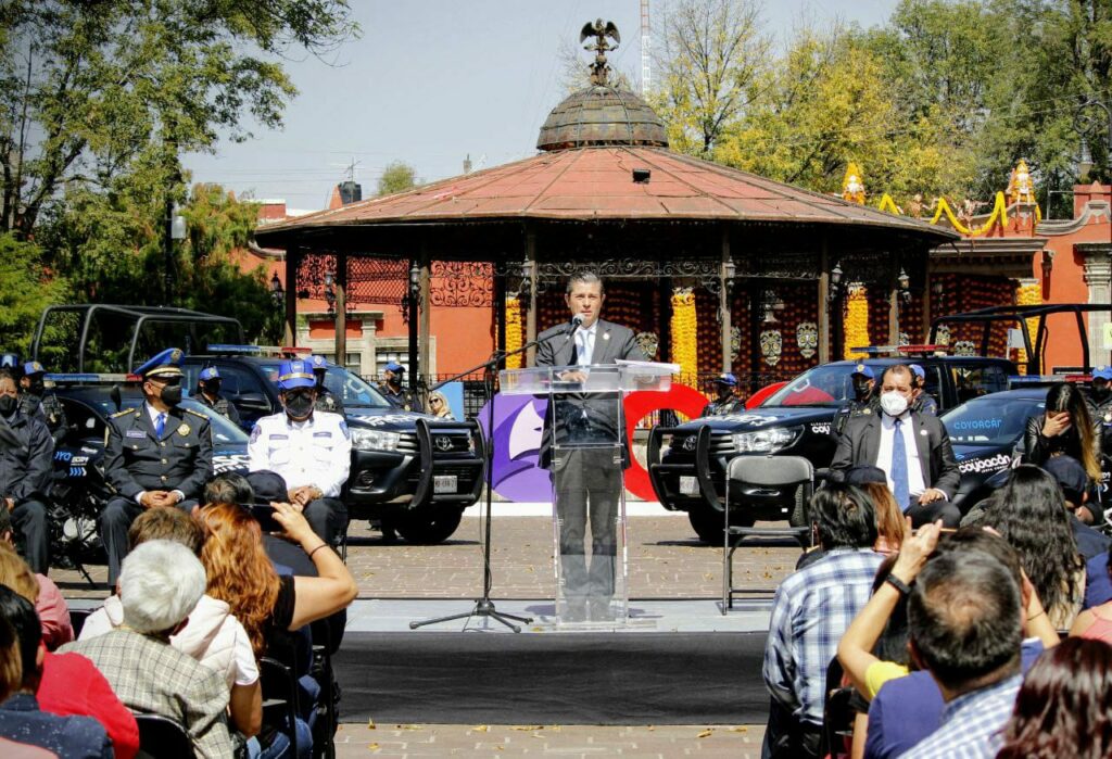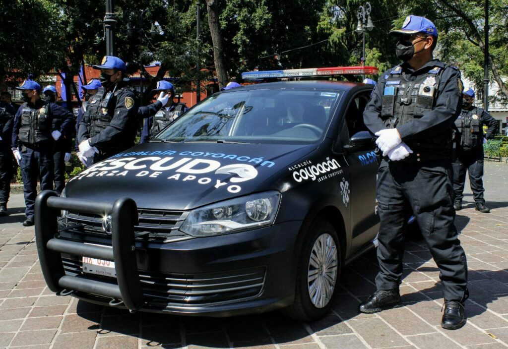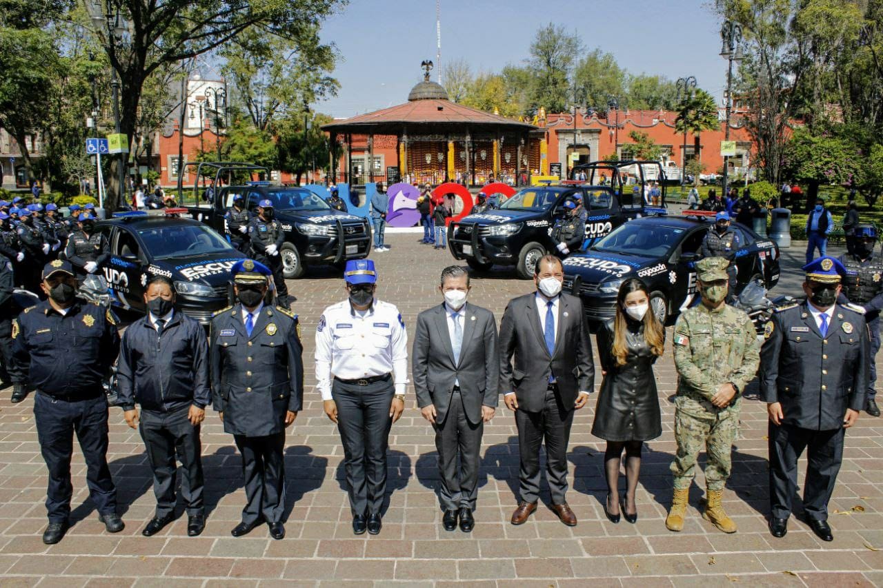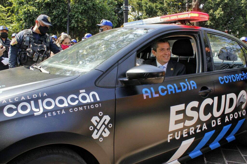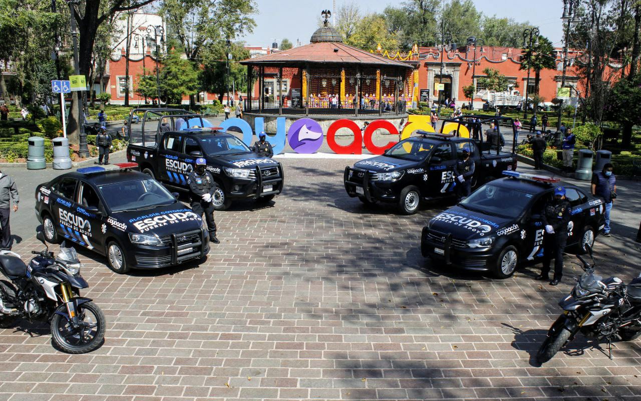 Acompañado por representantes de la Marina Armada de México, de la Fiscalía de la Ciudad de México, de la Secretaría de Seguridad Ciudadana de la capital del país, así como de la Policía Auxiliar, el alcalde Giovani Gutiérrez presentó la nueva imagen de las unidades de tierra, patrullas sedán, camionetas y motocicletas, bajo el concepto Escudo Coyoacán.