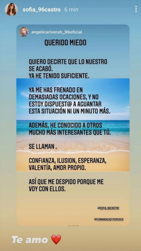 A través de una storie, Angélica reveló sentirse preparada para dejar atrás sus miedos y comenzar a desarrollar nuevos proyectos que no habían podido salir debido a que el temor que la había acechado por tanto tiempo no se le permitía seguir su vida con normalidad.