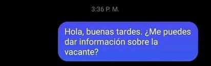 Lo anterior se puede leer en una conversación por mensajes privados en la que una persona interesada en el anuncio de trabajo pregunta más detalles sobre el puesto solicitado.
