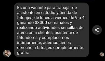 “Realizando actividades sencillas de atención a clientes, asistente de tatuadores y complacernos íntimamente”, se puede leer en el mensaje del empleador. Lo anterior a cambio de tatuajes gratis.