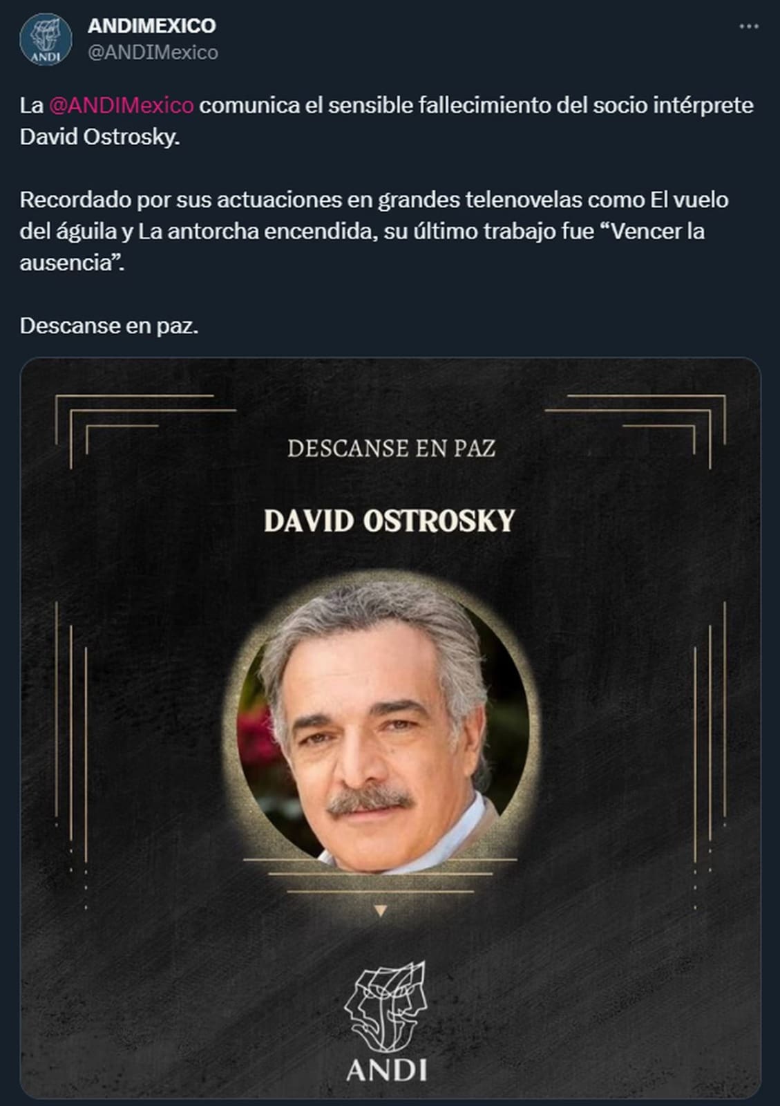 “La Asociación Nacional de Intérpretes comunica el sensible fallecimiento del socio intérprete David Ostrosky. Recordado por sus actuaciones en grandes telenovelas como El vuelo del águila y La antorcha encendida, su último trabajo fue “Vencer la ausencia”. Descanse en paz”, se lee en el texto.