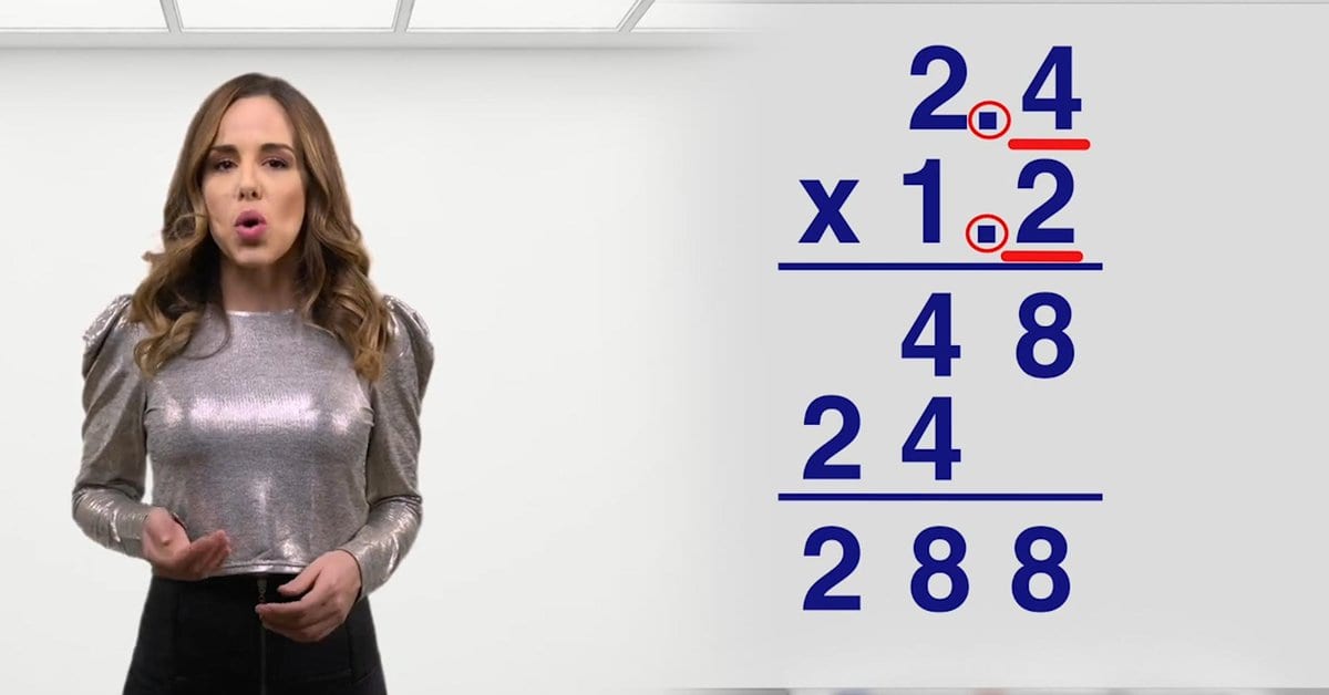 En la grabación viral, una mujer comienza a explicar cómo se realizan multiplicaciones con puntos decimales, tomando en el ejemplo las siguientes dos cifras: 2.4 y 1.2. Luego indica que se debe realizar la operación como si no existieran los puntos decimales.