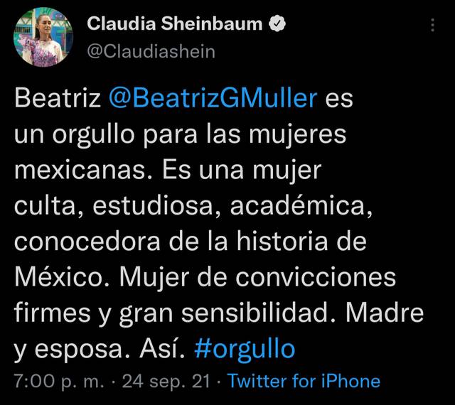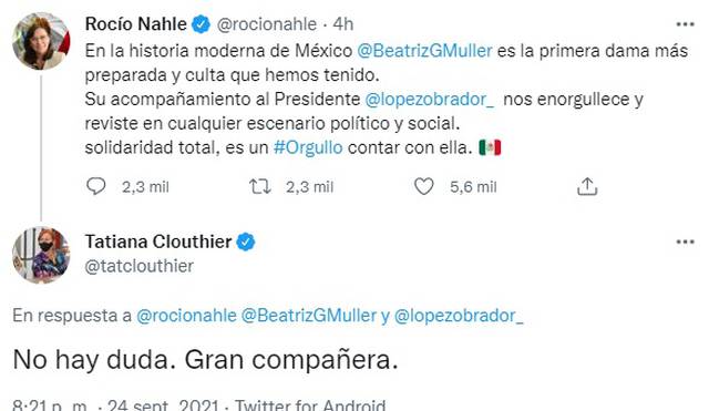 “En la historia moderna de México Beatriz Gutiérrez Müller es la primera dama más preparada y culta que hemos tenido. Su acompañamiento al presidente AMLO nos enorgullece y reviste en cualquier escenario político y social. Solidaridad total, es un #Orgullo contar con ella”, dijo Rocío Nahle, secretaria de Energía a través de su Twitter.