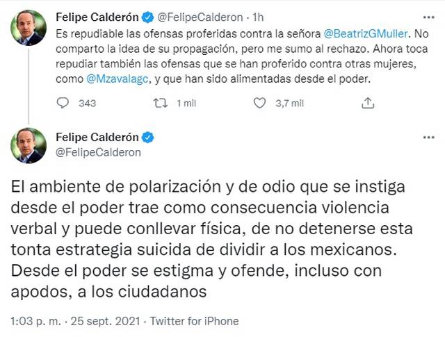 A través de su cuneta Twitter, Felipe Calderón se sumó al rechazo de los ataques contra la escritora Beatriz Gutiérrez Müller, pese a que no comparte la idea de su propagación.