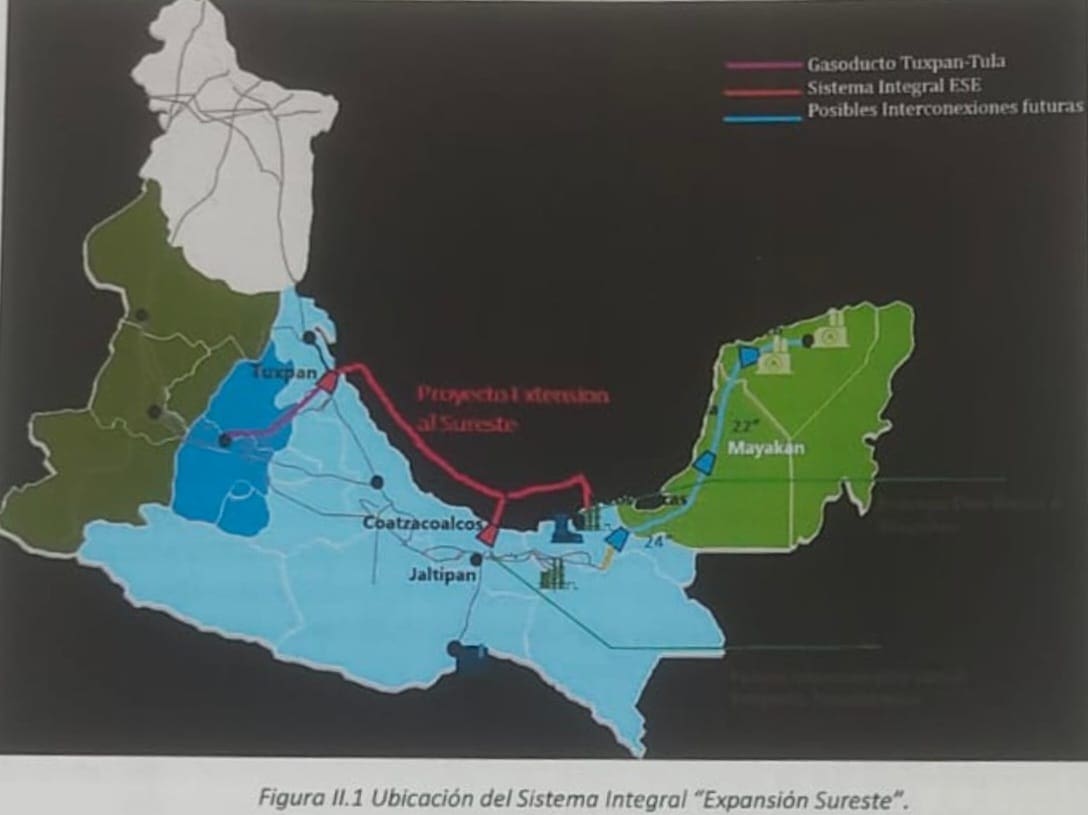 Las Manifestaciones de Impacto Ambiental (MIA) presentadas por la empresa promovente del proyecto señalan que “el Sistema Integral “Gasoducto Extensión Sureste” consistirá́ en un gasoducto terrestre de 36” Diámetro Nominal (DN) que se extenderá desde la interconexión del sistema Tuxpan Tula en la Estación de Medición y Regulación (ERyM) Montegrande, hasta la Estación de Compresión (EC) Veracruz Norte de una total de aprox. 20.100 km de longitud que será́ construida en el municipio Tuxpan (Punto Recepción). Luego, la ruta continuará en alta mar por medio de un ducto de 36” DN y entrará nuevamente a la zona terrestre hasta llegar a la EC en Coatzacoalcos. Desde la EC de Coatzacoalcos, la ruta regresará a la zona marina hasta entrar nuevamente a la zona terrestre y llegar finalmente a la ERyM Dos Bocas en el Municipio de Paraíso, Tabasco (Punto de Entrega), donde el gas natural será́ distribuido a las instalaciones de CFE. El ducto transportará 1,390 MMPCD (Millones de Pies Cúbicos Diarios) de gas natural.”