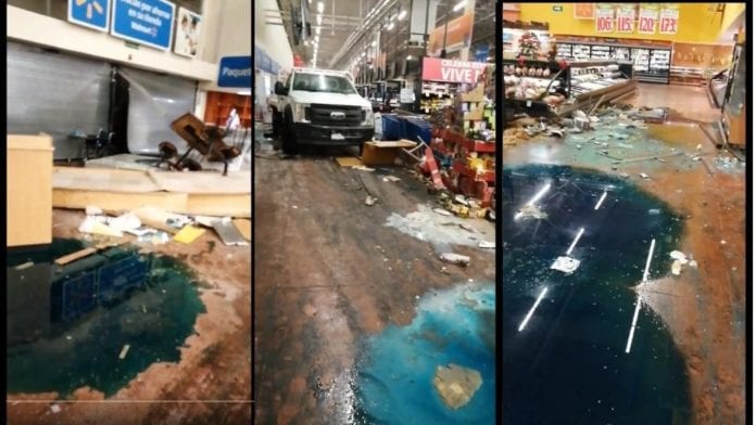 Un grupo armado entró a Walmart con todo y camionetas, destrozando por completo el área y luego se dió a la fuga dejando las camionetas al interior del inmueble.