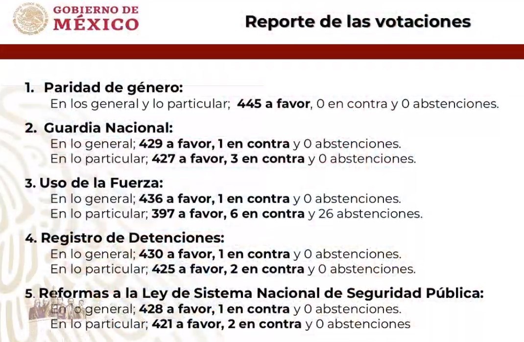 Durante su tradicional conferencia de prensa matutina en Palacio Nacional, detalló que la ley secundaria de la Guardia Nacional fue aprobada en lo general con 429 votos a favor, uno en contra y cero abstenciones, un “hecho histórico” como reforma constitucional.