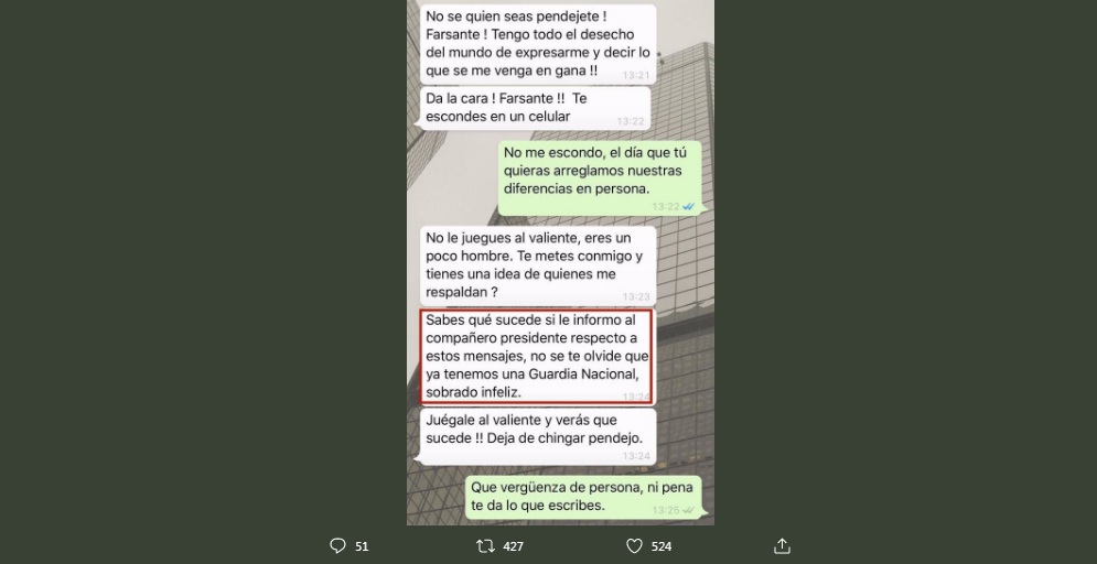 “Sabes que sucede si le informo al compañero presidente respecto a estos mensajes, no se te olvide que ya tenemos una Guardia Nacional, sobrado Infeliz.” (sic).