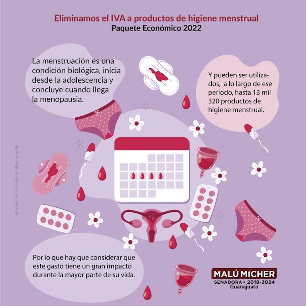 En 2020 el colectivo Digna mx (Menstruación Digna México) llevó al Congreso la propuesta de una estrategia para cambiar la Ley del IVA y quitarle el impuesto a los productos de gestión menstrual.