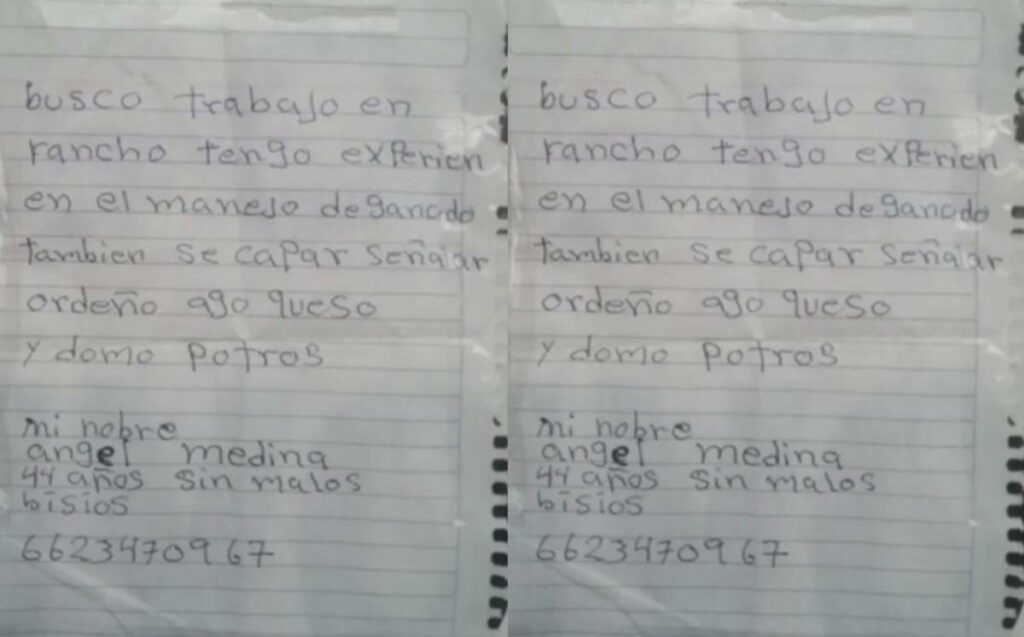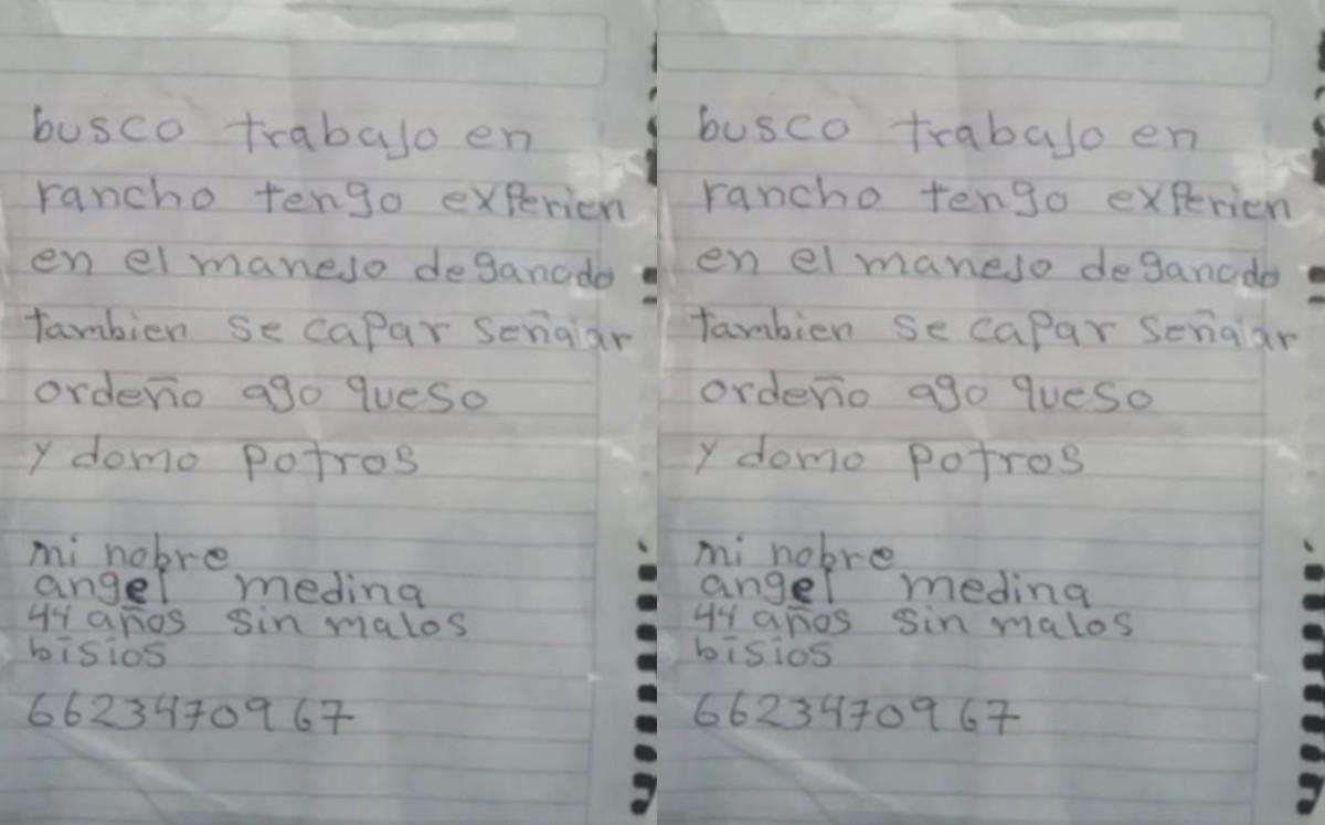 La imagen del CV del hombre se hizo viral y en ella se puede apreciar que efectivamente está todo escrito a mano: “Busco trabajo en rancho, tengo experiencia en el manejo de ganado, también sé capar, ordeñar, hago queso y domo potros. Mi nombre es Ángel Medina, de 44 años, sin malos vicios“.