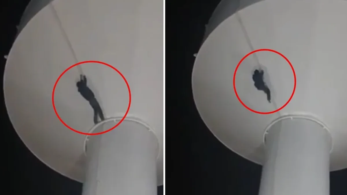 “¡Te vas a caer!”, se escucha decir a la mujer mientras intenta persuadirlo. La grabación evidencia cómo el sujeto se sujeta de una cuerda alrededor del tanque, pero finalmente pierde el equilibrio y cae al vacío.