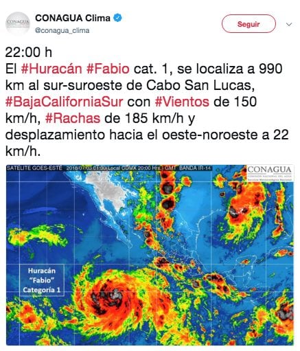 El Servicio Meteorológico Nacional (SMN) reportó que este martes el huracán Fabio categoría 1 en la escala Saffir-Simpson, se fortalecerá al sur de la Península de Baja California.