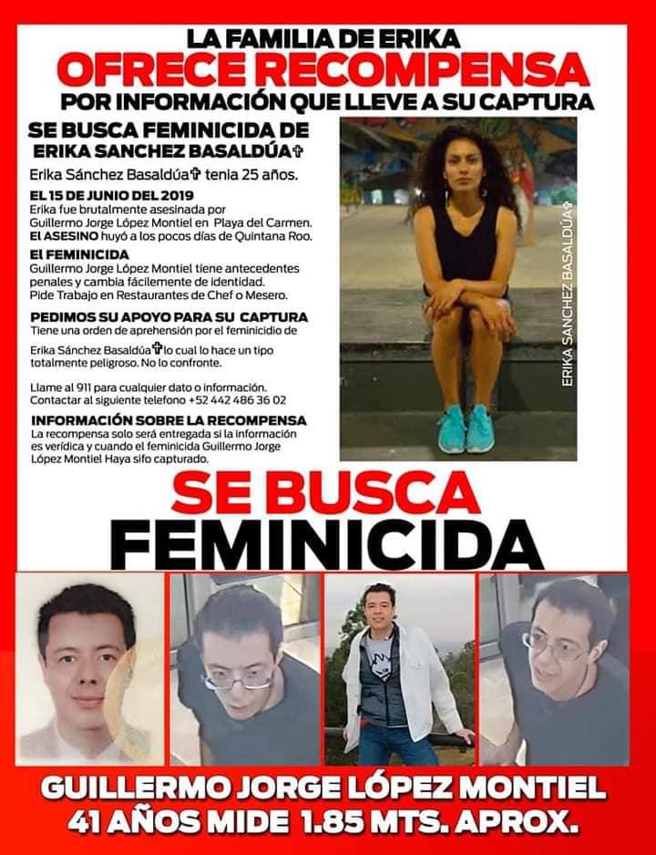 Ya son más de dos años del feminicidio de Erika; Guillermo Jorge López Montiel es originario de CDMX, tiene 39 años de edad, mide aproximadamente 1.85 m de altura, es delgado, con lentes de fondo de botella. Este tipo es peligroso, si lo ven se recomienda inmediatamente llamar a la Policía al 911, no confrontarlo. Tiene antecedentes penales y una orden de aprehensión por el feminicidio dede Erika Sánchez Basaldúa el 15 de junio del 2019 en Playa del Carmen, Quintana Roo.