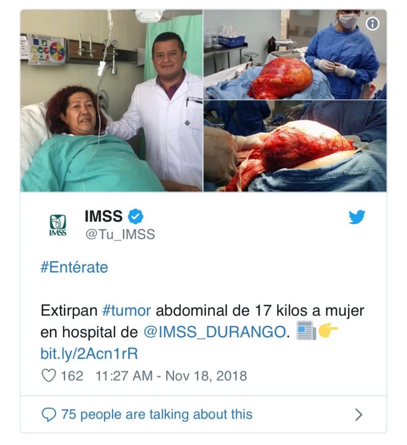 Médicos del Instituto Mexicano del Seguro Social (IMSS) en Durango, extirparon exitosamente un tumor de 17 kilos a una mujer.