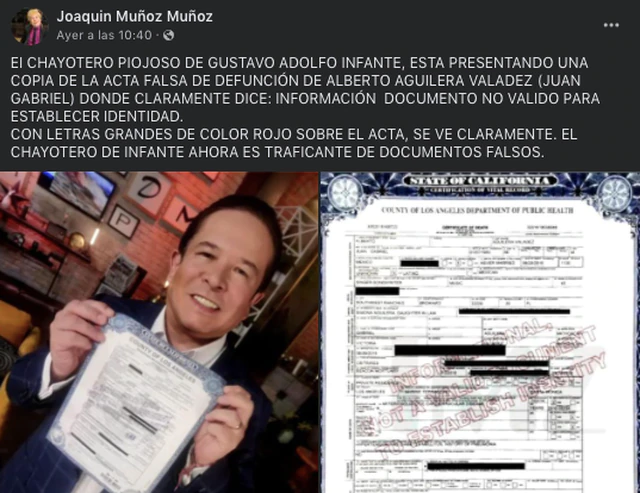 Por otro lado, Joaquín Muñoz se echó de enemigo a Gustavo Adolfo Infante a quien tacha de “chayotero piojoso” y acusa de “traficar documentos falsos” luego de presentar la supuesta acta de defunción de Juan Gabriel.