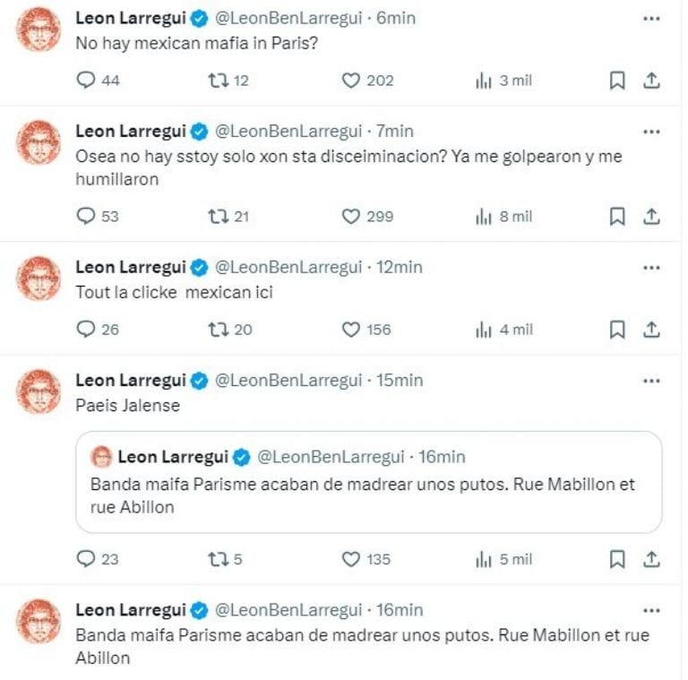El intérprete, de 50 años, empezó su denuncia escribiendo lo siguiente: “Banda maifa Parisme acaban de madrear unos put***. Rue Mabillon et rue Abillon”. Seguido de ese mensaje, lo acompañó con “Paeis Jalense” y “Tout la clicke mexican ici”.