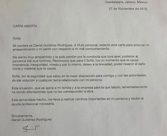 Después de que se viralizara el video donde el director del restaurante La Gorda, en Zapopan, Jalisco, arremetiera a patadas el vehículo de una conductora que lo chocó por accidente, y luego le arrojara café, Daniel Gutiérres Rodríguez se disculpó con Sofía.