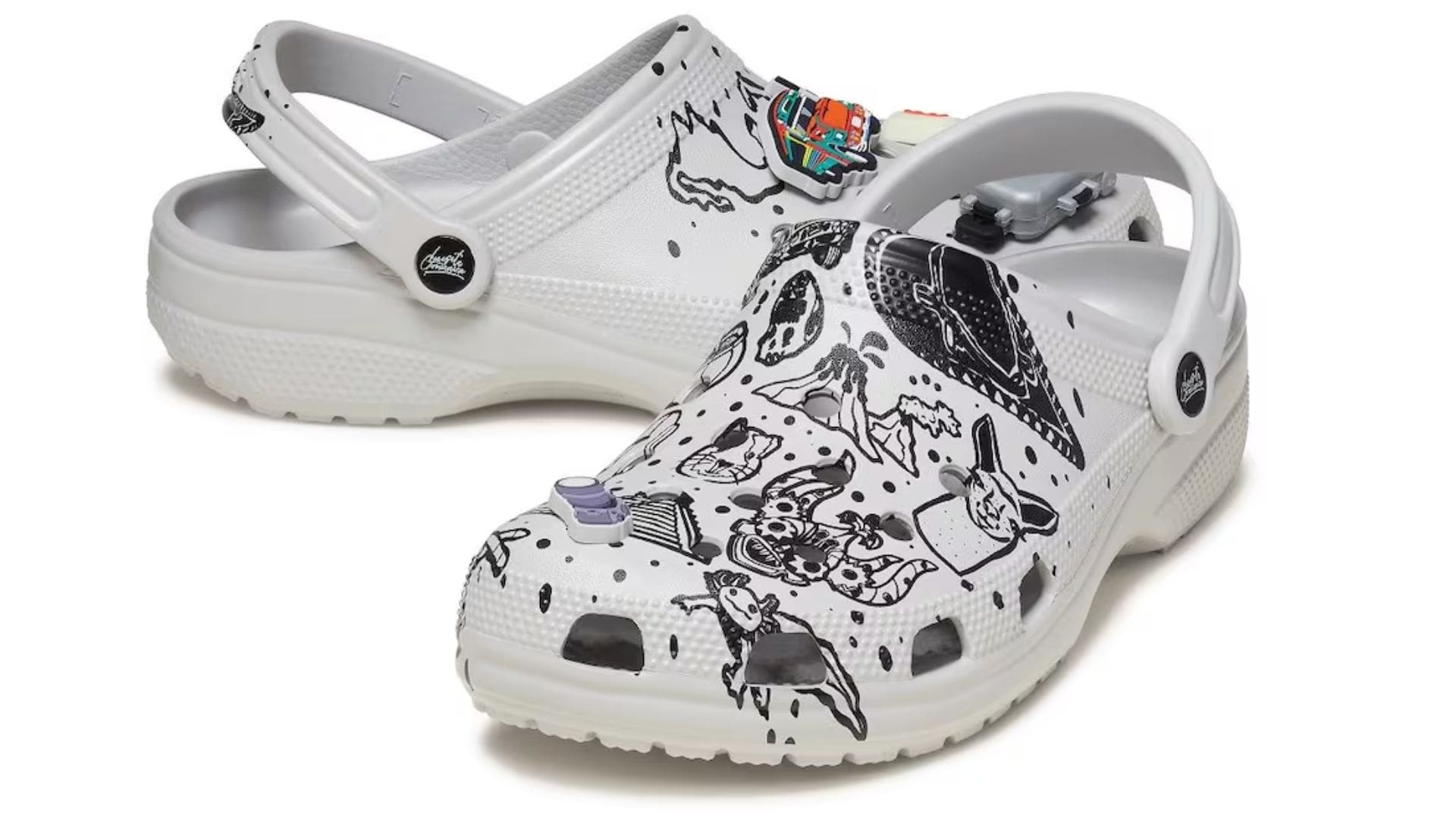 La silueta del calzado es la tradicional Classic Clog, con un tono gris y un diseño en negro, en el que se observa varios elementos distintivos de la región latinoamericana, como un mate, un ajolote, volcanes y montañas, una llama, máscaras y más objetos relacionados con el continente americano.