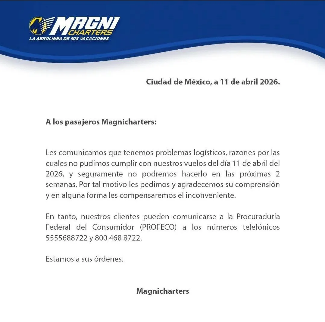 "Les comunicamos que tenemos problemas logísticos, razones por las cuales no pudimos cumplir con nuestros vuelos del día 11 de abril del 2026, y seguramente no podremos hacerlo en las próximas dos semanas. Por tal motivo les pedimos y agradecemos su comprensión y en alguna forma les compensaremos el inconveniente", anunció la empresa Magnicharters la tarde de este sábado.