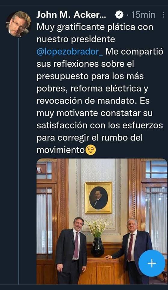 Pero como ya se señalaba, John M. Ackerman también acudió a Palacio Nacional y tras la reunión que tuvo con AMLO, también hizo una publicación en sus redes. Este el texto que publicó. Vean las similitudes con el de Mario Delgado.